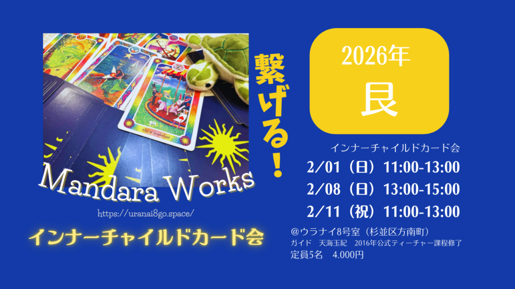 MENU2026年2月 繋げる!インナーチャイルドカード会立春を越えて新しいサイクルへ「艮」〜繋げる!Mandaraインナーチャイルドカード会これまでの開催レポご紹介 2026年2月 繋げる!インナーチャイルドカード会 … 続きを読む 2026 繋げる!インナーチャイルドカード会