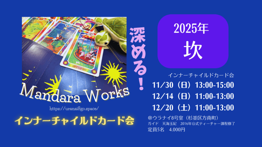 MENU2025年12月 深める!インナーチャイルドカード会冬至は新しい一年を占うのに最適「坎」〜深める!Mandaraインナーチャイルドカード会これまでの開催レポご紹介 2025年12月 深める!インナーチャイルドカー … 続きを読む 12/14(日)12/20(土)2025 深める!インナーチャイルドカード会