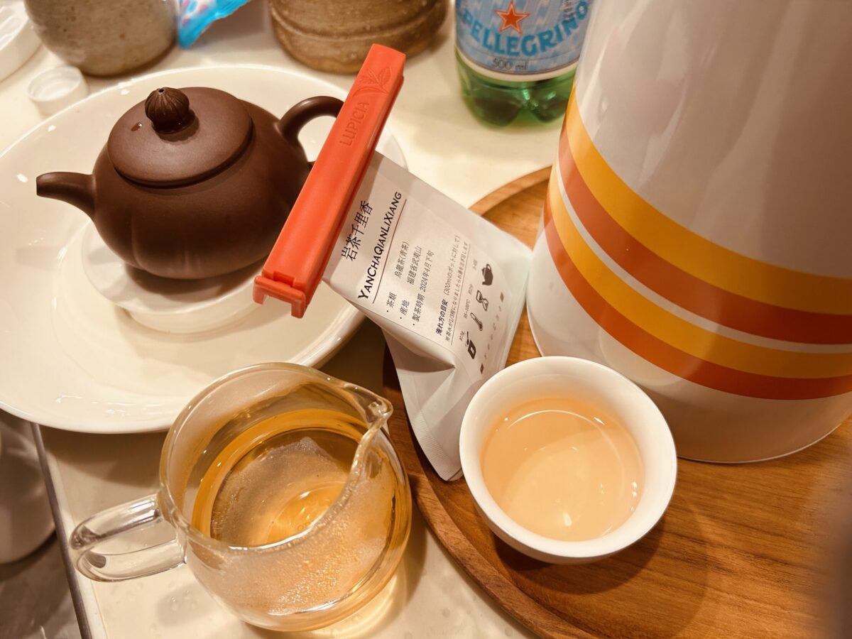 パッケージをまじまじと、裏表すみからすみまで眺めます。ふむふむ。岩茶千里香?ってことはきっと香りが千里を超えて漂うほど素晴らしいってことであろうな?(漢字文化圏ってすげー)