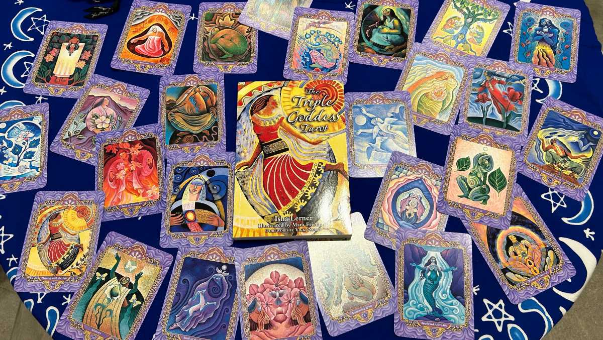 綺麗ですね。インナーチャイルドカードのイーシャ先生のデッキ、トリプルゴッデスタロットです。3人の女神は「少女ー母ー老女」のセットで「三相女神」と呼ばれるようです。このデッキでは、タロットの大アルカナ+追加4枚→26柱の女神が描き出されています。