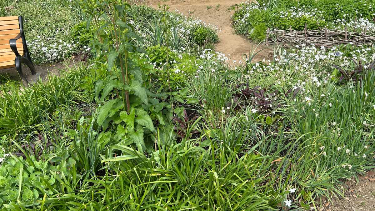 3年目の宿根草ガーデンはこんなかんじ。いまはまだウォーミングアップ状態ですね。これからどんどん成長してみんな姿を変えていきます。ここのいちばんいい季節は7月初旬くらいだそうです。