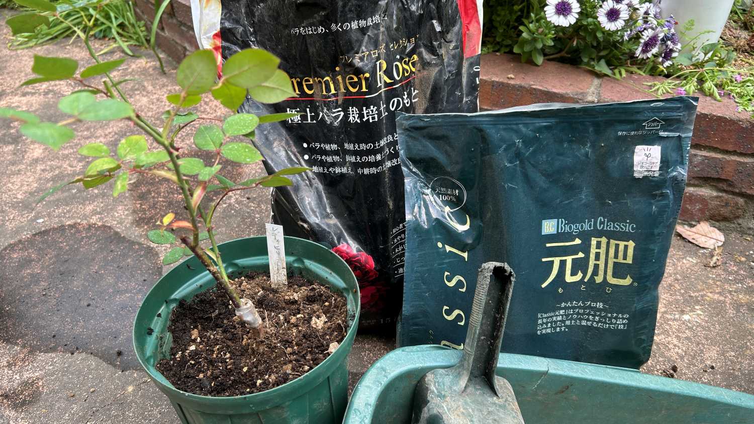 苗は今年の2月に接ぎ木したばかりの新苗です。(丈夫な野ばらの株に、育てたい品種の枝をくっつけて増やします)まだふにゃふにゃの若い状態なので、春のつぼみは摘み取ります。秋には咲かせられるそうです。これがさらに大きくなると大苗と呼ばれます。
